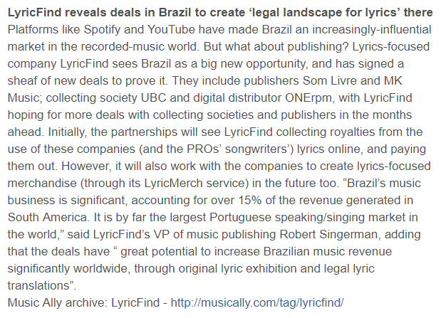 “We’ve been working in Brazil, now our fifth biggest market, for years, but this agreement with ABRAMUS Digital adds a huge lyric repertoire to our service,” explains Robert Singerman, SVP of International Publishing for LyricFind. “We’re expanding access to Brazilian lyrics, going way beyond the hits into amazing lyrics from writers and artists of all styles and at all stages of their careers.”